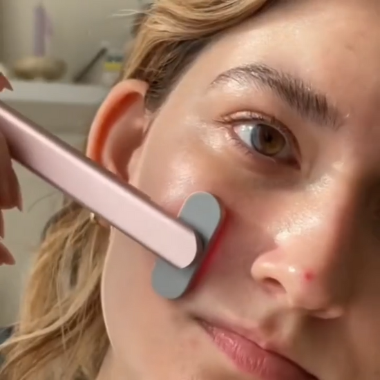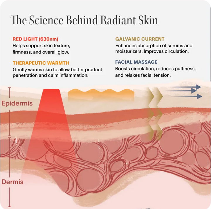 It uses red light, warmth, and vibration to reduce puffiness, fine lines, and brighten the skin.